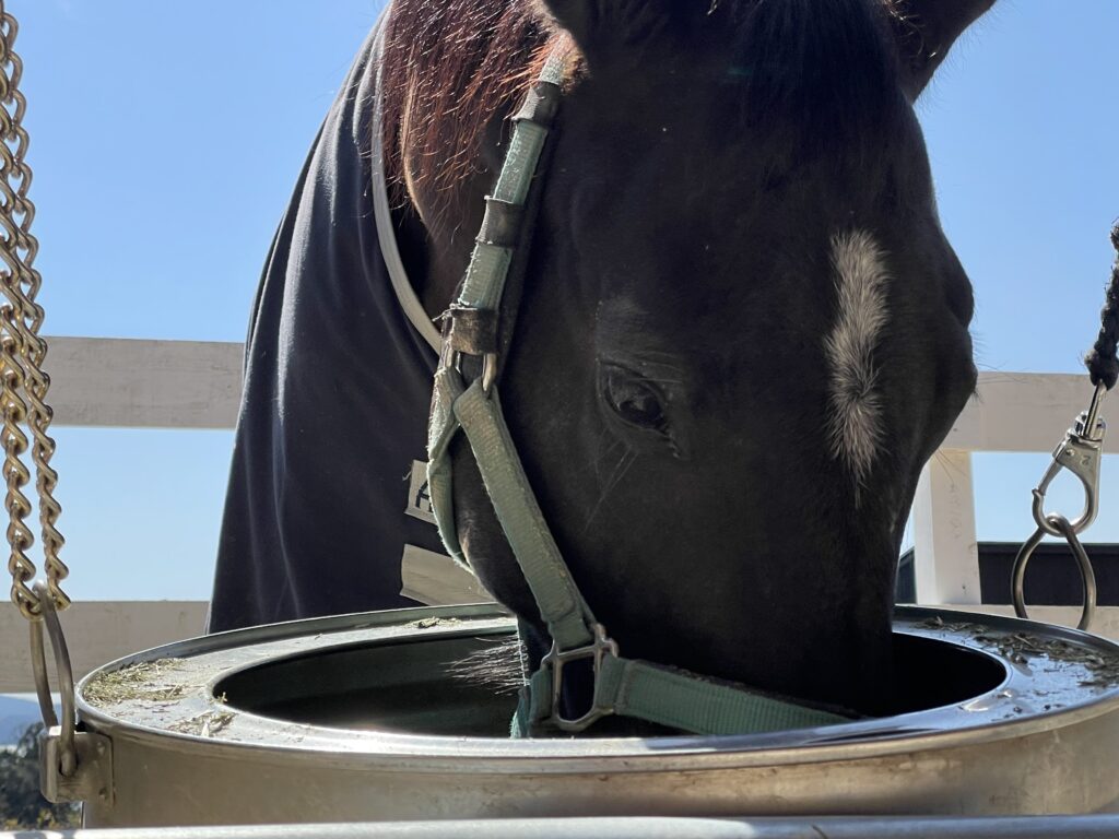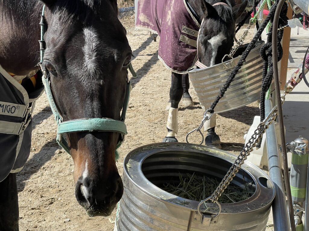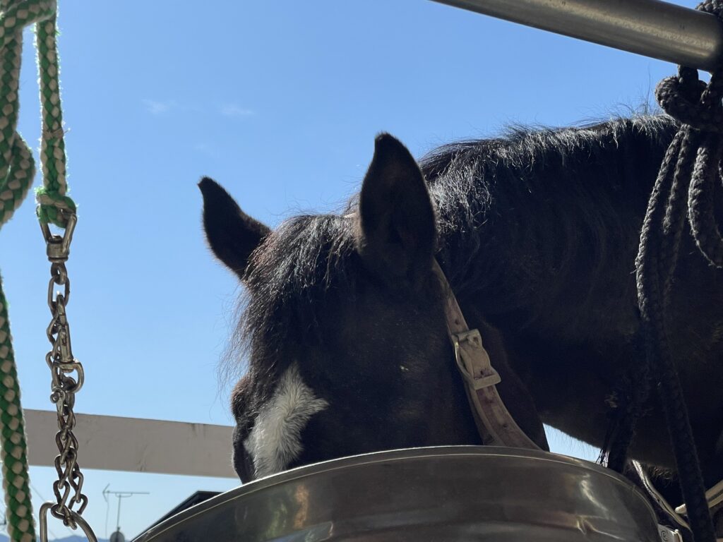この日はお天気が良かったので、お外でお昼ご飯を食べました❣️ゴーくんはカメラ目線です💕人が食べている物がおいしそうに見えるのは、馬も同じなのか、しばらくしたらゴーくんがベリーちゃんのお茶碗の中のものをモグモグ…ベリちゃんは優しいから文句も言わずにゴーくんのお茶碗の方へ移動します💦『ゴーくん💢自分の食べてくれる⁉️😠ベリちゃんごめんね🌀』と2人を定位置に戻しても、ゴーくんは同じことを繰り返します。『もぉ母さん、前から離れられないじゃん‼️』2人を眺めながら、私もお昼を食べることにしました🍙😊