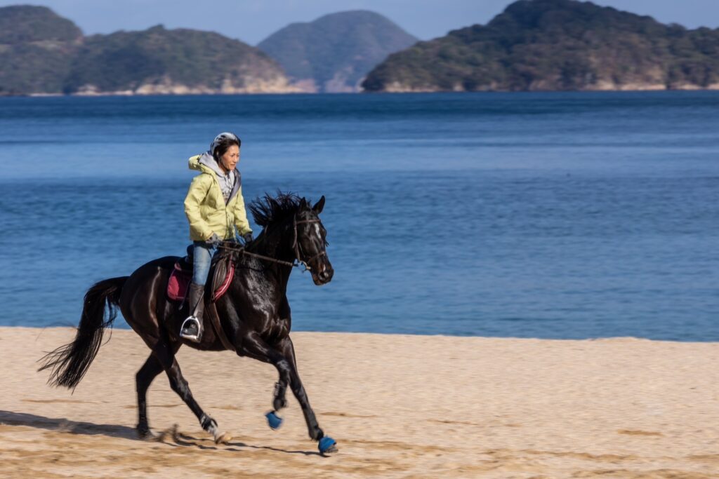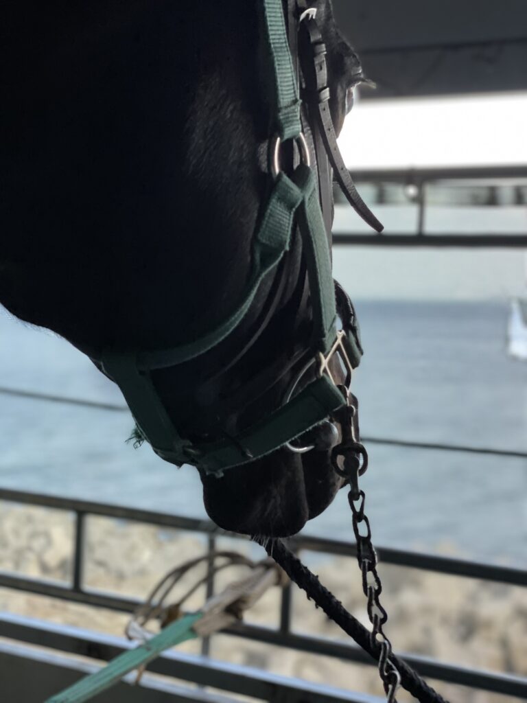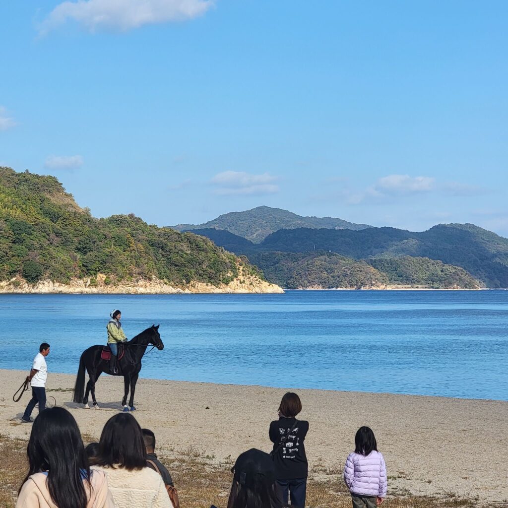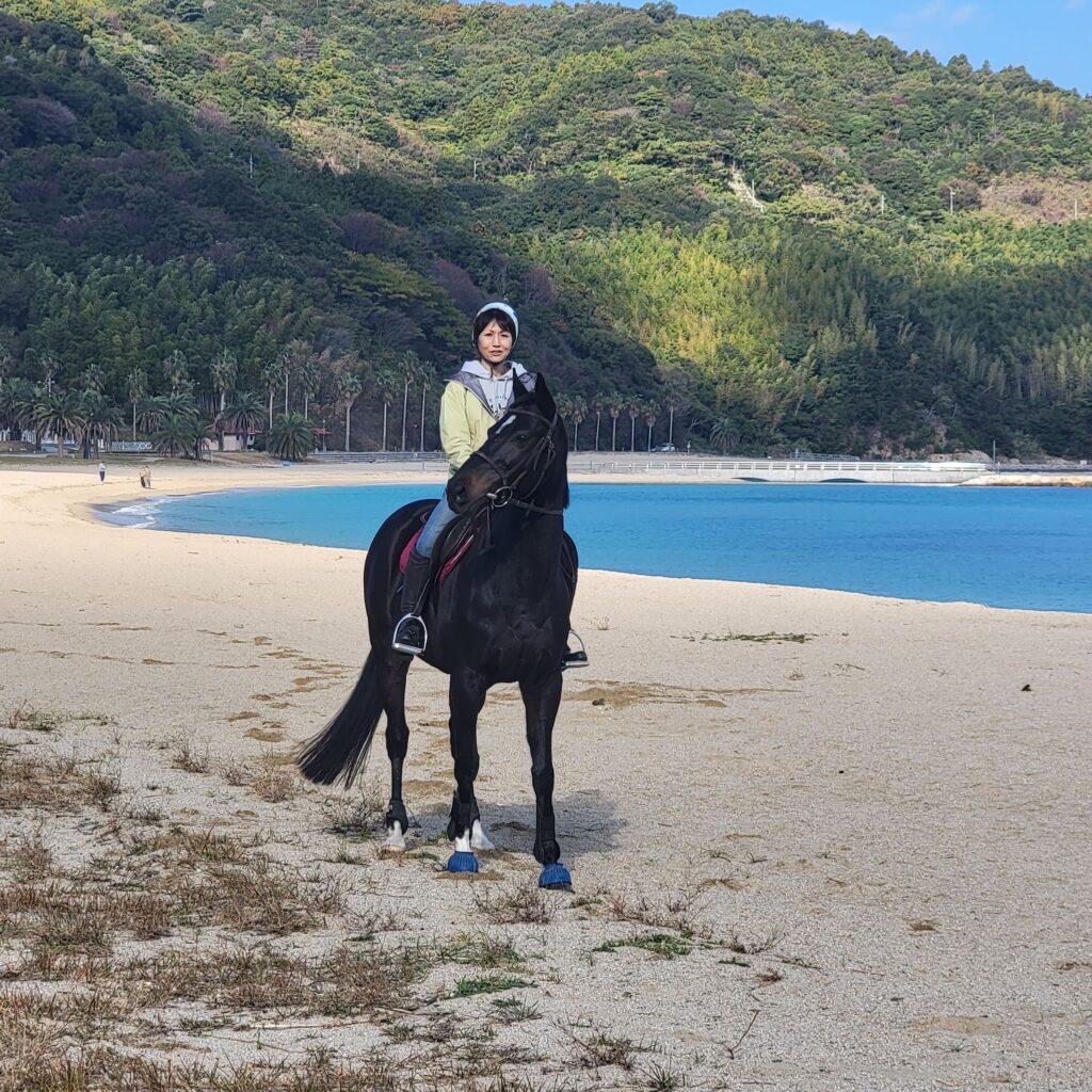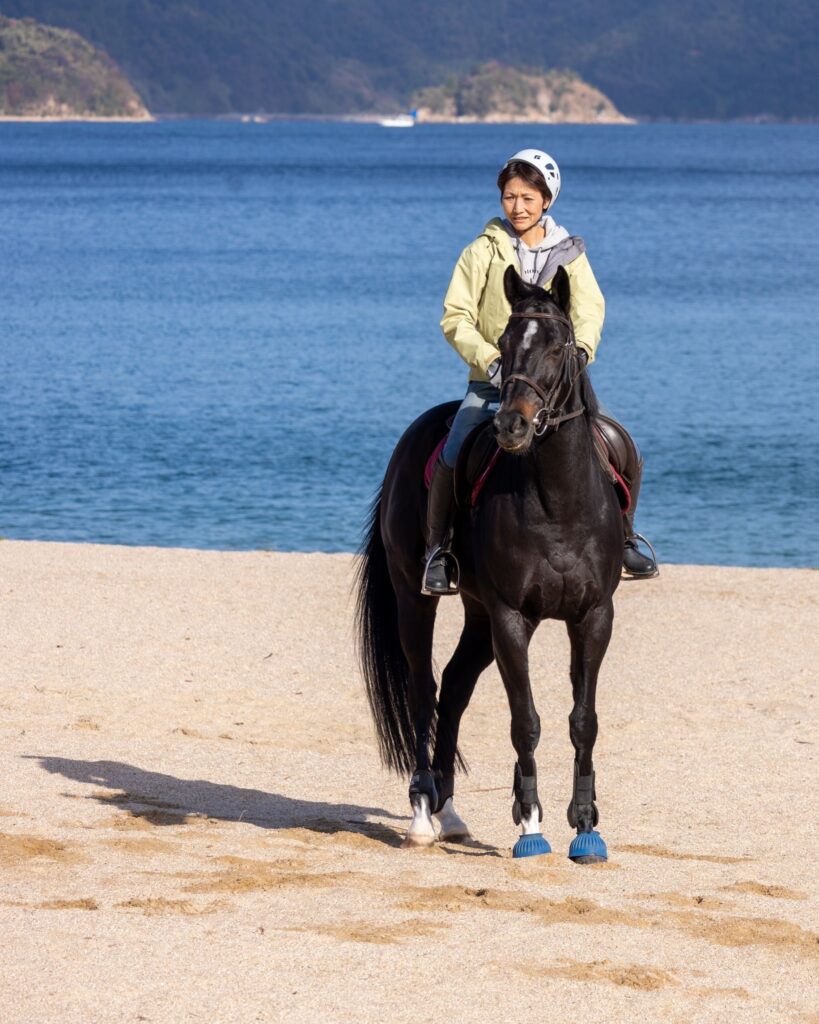 浜辺を颯爽と走る姿を想像しておられることは理解していましたが、そうはいかないのが馬という生き物です。寄せては引く波を味方には感じられないゴーくんは、屁っ放り腰で砂浜を歩き、少しずつ慣れて……恐る恐る汗だくになって走りました💦アブ、ドローン、静電気に続き、波もゴーくんの敵に認定されました🌀