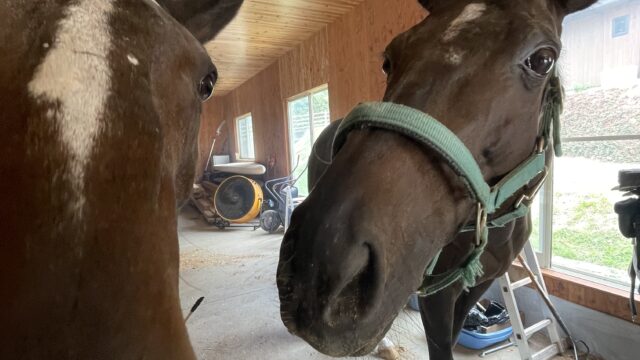 今日のゴーくんとベリーちゃんです💕2人の関係は、まるでジャニーズの素っ気ないアイドルとおっかけのおばちゃんです😊いつもは近寄っても顔を近付けるくらいなんですが、今日は肩の方までこちょこちょしてました。もちろんベリーは喜びのオタケビ❣️その後のベリーちゃんはゴーくんが行く方に向いて、馬小屋の中でダッシュ💨目をキラキラさせています✨『あーん、ベリーのうんちやおしっこの染み込んだおがくずがぐっちゃぐちゃになるよぉー😭』と言うのは私です💦