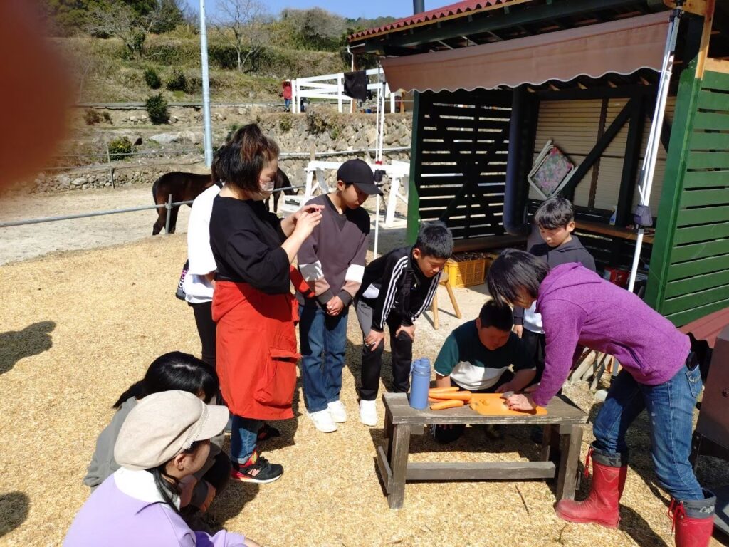 オリエンテーションから始め、馬とのふれあい、野外クッキング、薪割り、体験乗馬etc.