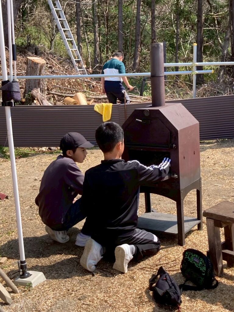 お昼ご飯は、薪ストーブやピザ釜で野外クッキング🍳